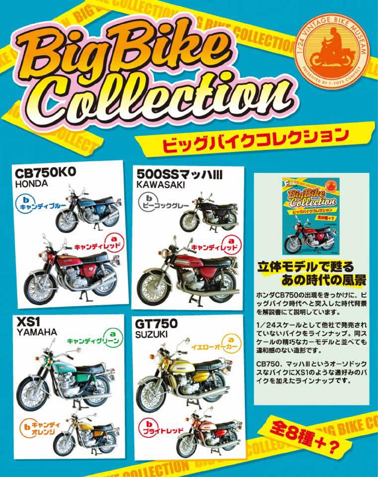 Big Bike Collection 1/24 Vintage Bike Museum This exceptional 1/24 scale vintage bike collection from F-Toys will leave your senses trailing in disbelief at the stunning level of detail. From the Honda's CB750 KO to Suzuki's GT750 each model is beautifully painted with minimal snap together assembly.